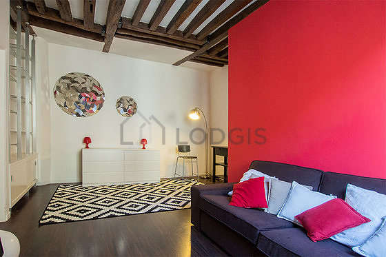 This apartment consists of a charming living room with wooden floor and its double-glazed windows and view on courtyard. This quiet living room is furnished and equipped for a comfortable stay: tv, sofa, 1 armchair(s), bookcase, shelves, storage space, cupboard, wooden beams, entry way table, painting.