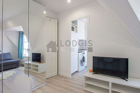 This apartment consists of a attractive living room with wooden floor view on courtyard. This quiet living room is furnished and equipped for a comfortable stay: tv, linen, quilt, desk, wardrobe, cupboard, 1 chair(s), tv stand1 sofabed(s) of 180cm.