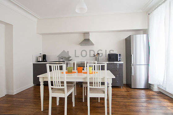 This apartment consists of beautiful kitchen with wooden floor and all the essential equipment for your daily life: hob, refrigerator, freezer, oven, microwave oven, extractor hood, toaster, kettle, coffee-maker, dining table, cupboard, crockery, 4 chair(s).