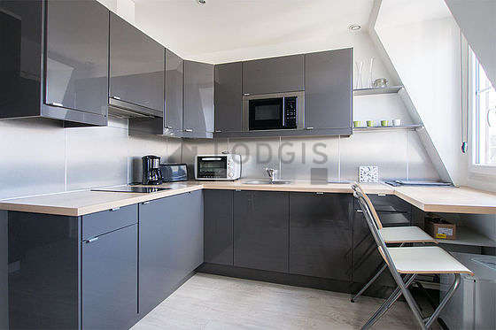 This apartment consists of beautiful kitchen with wooden floor and all the necessary equipment for your daily life: hob, refrigerator, freezer, oven, microwave oven, extractor hood, toaster, coffee-maker, cupboard, crockery, 2 chair(s), bar.