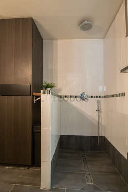 This apartment is equipped with a pleasant bathroom with double-glazed windows. This bathroom is furnished with all the equipment you need for a comfortable stay: bath towels, wardrobe, shelves, cupboard, separate shower, sink. The toilets are separated from the bathroom and located in an independant room.