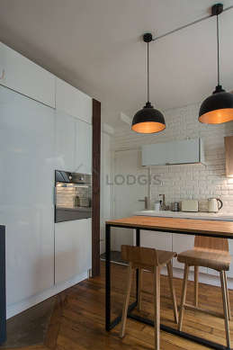 This apartment consists of great kitchen with wooden floor and all the necessary equipment for your daily life: hob, refrigerator, freezer, oven, microwave oven, extractor hood, toaster, kettle, dining table, cupboard, crockery, 6 chair(s).