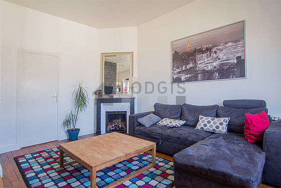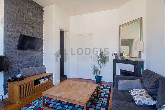 This apartment consists of a pleasant living room with wooden floor and its double-glazed windows and view on road. This very quiet living room is furnished and equipped for a comfortable stay: sofa, coffee table, exposed bricks, wall light, painting.