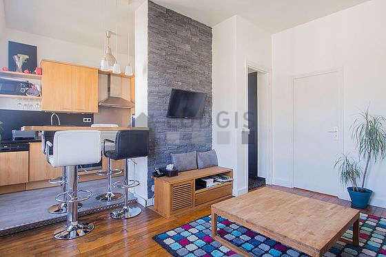 This apartment consists of great kitchen close to the living room with linoleum floor and all the essential equipment for your daily life: hob, freezer, oven, microwave oven, extractor hood, toaster, kettle, coffee-maker, cupboard, exposed bricks, 4 chair(s), bar, lamp, bin.