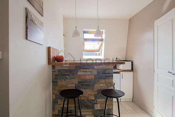 This apartment consists of great kitchen with wooden floor and all the essential equipment for your daily life: hob, microwave oven, stool.