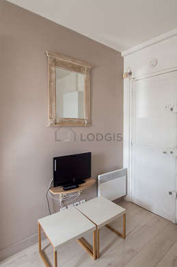 Living roomThis apartment consists of a beautiful living room with wooden floor and its windows. This very quiet living room is furnished and equipped for a comfortable stay: tv, sofa, coffee table, shelves.