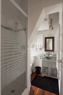 This apartment is equipped with a pleasant bathroom and bright. This bathroom is furnished with all the equipment you need for a comfortable stay: bath towels, shelves, cupboard, separate shower, hair-dryer, sink, mirror, towel rack, towel drying radiator. The toilets are located in the bathroom.