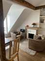 This apartment consists of a charming living room with wooden floor and its double-glazed windows. This living room is furnished and equipped for a comfortable stay: linen, quilt, 1 armchair(s), dining table, coffee table, shelves, cupboard, wooden beams, fireplace, 1 chair(s), bedside table1 sofabed(s) of 140cm.