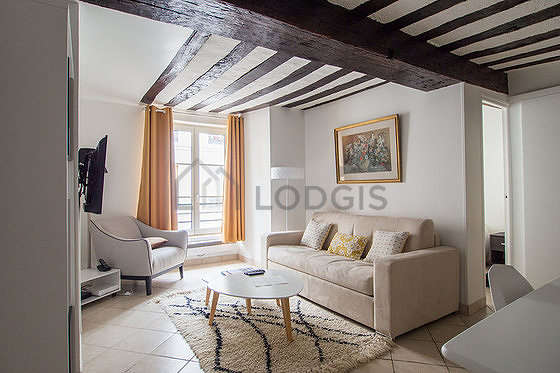 This apartment consists of a pleasant living room with tile floor and its double-glazed windows. This quiet living room is furnished and equipped for a comfortable stay: tv, 1 armchair(s), dining table, shelves, wooden beams, 4 chair(s), set of tables1 sofabed(s) of 160cm.