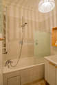 This apartment is equipped with a bathroom. This bathroom is furnished with all the equipment you need for a comfortable stay: shelves, bath tub, sink, towel drying radiator. The toilets are separated from the bathroom and located in an independant room.