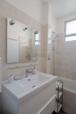 This apartment is equipped with a pleasant bathroom and bright. This bathroom is furnished with all the equipment you need for a comfortable stay: shelves, bath tub, hair-dryer, wall light, mirror, towel rack. The toilets are separated from the bathroom and located in an independant room.