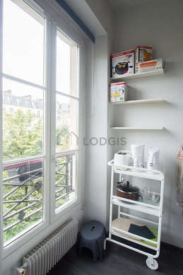 This apartment consists of a wonderful living room with wooden floor view on road. This very quiet living room is furnished and equipped for a comfortable stay: quilt, dining table, coffee table, wardrobe, bookcase, shelves, closet, stool1 sofabed(s) of 140cm.