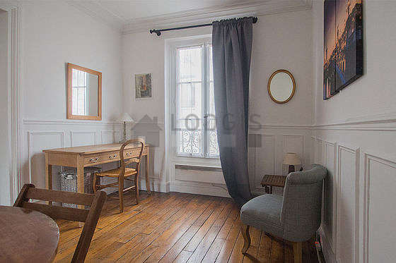 Living roomThis apartment consists of a pleasant living room with wooden floor view on courtyard. This quiet living room is furnished and equipped for a comfortable stay: tv, sofa, 1 armchair(s), coffee table, bookcase, entry way table, tv stand, curtains, painting.