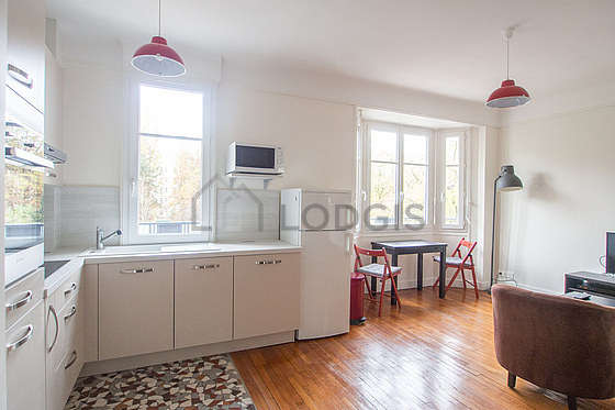 This apartment consists of a beautiful living room with wooden floor view on garden. This very quiet living room is furnished and equipped for a comfortable stay: tv, linen, quilt, 1 armchair(s), dining table, coffee table, wardrobe, cupboard, 2 chair(s)1 bed(s) of 140cm.