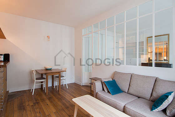 This apartment consists of a beautiful living room with wooden floor view on courtyard. This very quiet living room is furnished and equipped for a comfortable stay: tv, sofa, dining table, coffee table, 2 chair(s), tv stand.