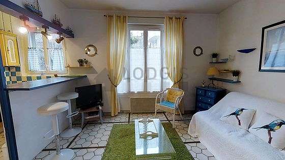This apartment consists of a pleasant living room with tile floor view on garden. This quiet living room is furnished and equipped for a comfortable stay: tv, sofa, coffee table, desk, storage space, 6 chair(s).