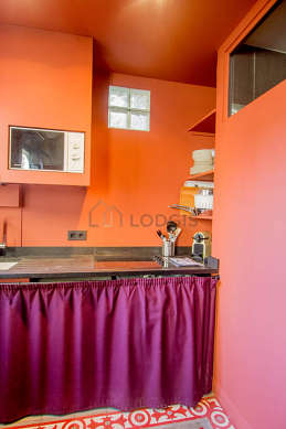 This apartment consists of a beautiful living room with wooden floor view on courtyard. This very quiet living room is furnished and equipped for a comfortable stay: tv, linen, quilt, 2 armchair(s), dining table, coffee table, wardrobe, shelves, cupboard, 2 chair(s)1 sofabed(s) of 140cm.