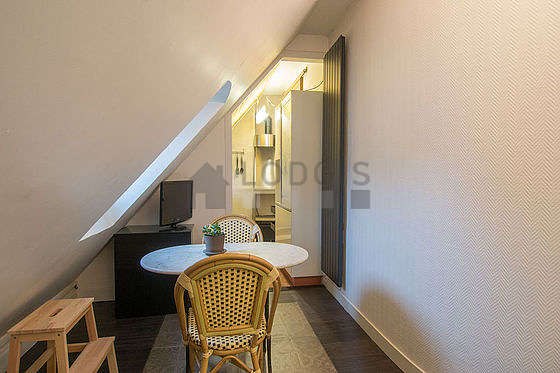 This apartment consists of a pleasant living room with wooden floor view on road. This very quiet living room is furnished and equipped for a comfortable stay: tv, linen, quilt, dining table, wardrobe, shelves, cupboard, 2 chair(s), stool1 sofabed(s) of 140cm.