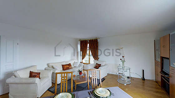 This apartment consists of a beautiful living room with wooden floor. This very quiet living room is furnished and equipped for a comfortable stay: tv, sofa, 2 armchair(s), dining table, coffee table, cupboard, 4 chair(s).