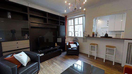 This apartment consists of a charming living room with wooden floor view on courtyard. This very quiet living room is furnished and equipped for a comfortable stay: tv, linen, quilt, sofa, 2 armchair(s), coffee table, bookcase, shelves, 2 chair(s), bar, bedside table1 sofabed(s) of 140cm.