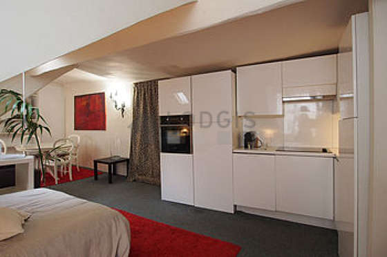 This apartment consists of beautiful kitchen with a carpeting floor and all the essential equipment for your daily life: hob, refrigerator, oven, microwave oven, freezer, extractor hood, toaster, kettle, coffee-maker, cupboard, crockery.