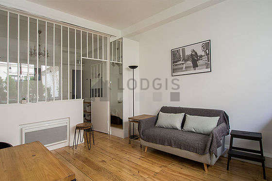 This apartment consists of a wonderful living room with wooden floor view on courtyard. This very quiet living room is furnished and equipped for a comfortable stay: tv, dining table, coffee table, shelves, 4 chair(s), stool1 sofabed(s) of 140cm.