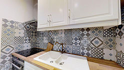 This apartment consists of great kitchen with tile floor and all the necessary equipment for your daily life: hob, refrigerator, oven, microwave oven, freezer, extractor hood, kettle, coffee-maker, dining table, shelves, cupboard, crockery, bar, soup plates, dessert plates, plates, bowl, casserole dish, cooking knives, lid, cutlery, wooden spoon, hot plate, mugs, work surface, baking dish, stove, bin, light, water glass.