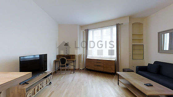 This apartment consists of a fabulous living room with wooden floor view on courtyard. This quiet living room is furnished and equipped for a comfortable stay: tv, linen, quilt, sofa, 1 armchair(s), coffee table, desk, wardrobe, shelves, closet, storage space, cupboard, 2 chair(s), bedside table, lamp, pouffe, curtains1 sofabed(s) of 160cm.