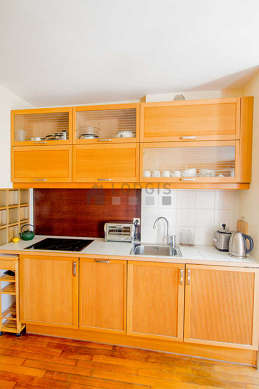 This apartment consists of great kitchen with wooden floor and all the necessary equipment for your daily life: hob, refrigerator, microwave oven, freezer, toaster, kettle, coffee-maker, shelves, cupboard, crockery.