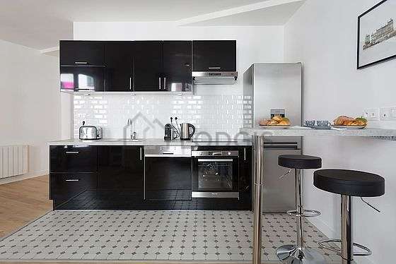 This apartment consists of great kitchen with tile floor and all the essential equipment for your daily life: hob, refrigerator, freezer, oven, microwave oven, extractor hood, toaster, kettle, coffee-maker, cupboard, stool, bar.
