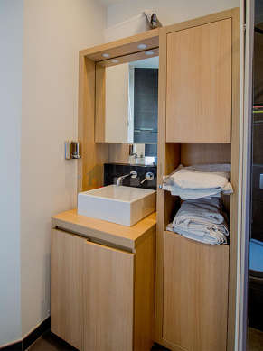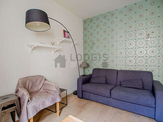 This apartment consists of a wonderful living room with wooden floor view on courtyard. This very quiet living room is furnished and equipped for a comfortable stay: tv, dining table, coffee table, shelves, stool1 sofabed(s) of 140cm.
