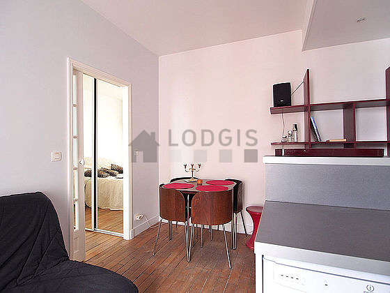 Living roomThis apartment consists of a attractive living room with wooden floor view on courtyard. This very quiet living room is furnished and equipped for a comfortable stay: linen, quilt, sofa, dining table, coffee table, shelves, 6 chair(s)1 sofabed(s) of 140cm.