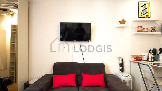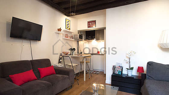 Living roomThis apartment consists of a charming living room with wooden floor view on courtyard. This very quiet living room is furnished and equipped for a comfortable stay: tv, linen, quilt, sofa, coffee table, wardrobe, shelves, closet, cupboard, wooden beams1 pullout bed(s) of 80cm.