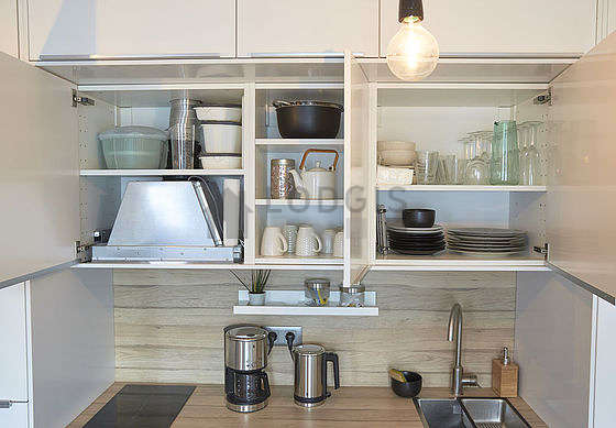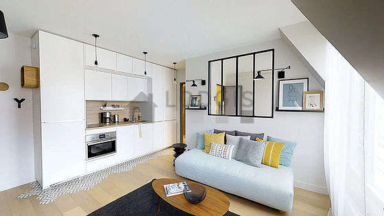 This apartment consists of a beautiful living room with wooden floor view on courtyard. This very quiet living room is furnished and equipped for a comfortable stay: tv, linen, quilt, sofa, 1 armchair(s), coffee table, shelves, 2 chair(s).