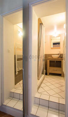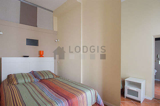 This apartment consists of a pleasant living room with tile floor view on courtyard. This very quiet living room is furnished and equipped for a comfortable stay: tv, sofa, dining table, coffee table, shelves, closet, wooden beams, 4 chair(s), tv stand.