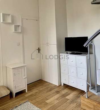 This apartment consists of a charming living room with wooden floor and its double-glazed windows and view on garden. This very quiet living room is furnished and equipped for a comfortable stay: tv, sofa, 1 armchair(s), coffee table, desk, wardrobe, shelves, closet, storage space, cupboard, floor lamp, coat stand, pouffe, set of tables, carpet.