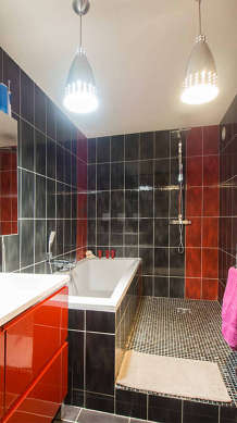 This apartment is equipped with a pleasant bathroom. This bathroom is furnished with all the equipment you need for a comfortable stay: bath towels, cupboard, bath tub, separate shower, sink, towel rack, towel drying radiator. The toilets are separated from the bathroom and located in an independant room.
