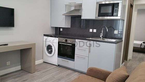 This apartment consists of beautiful kitchen with wooden floor and all the necessary equipment for your daily life: refrigerator, oven, microwave oven, extractor hood, toaster, shelves, cupboard, crockery.