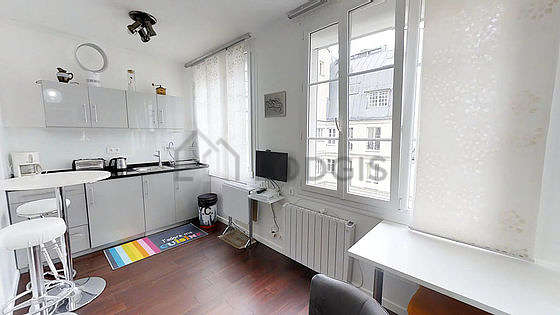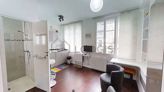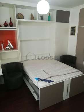 This apartment consists of a beautiful living room with wooden floor view on courtyard. This very quiet living room is furnished and equipped for a comfortable stay: tv, linen, quilt, 2 armchair(s), desk, wardrobe, shelves, closet, cupboard, 1 chair(s)1 murphy bed(s) of 140cm.