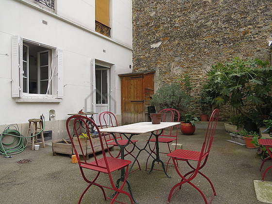 Living roomThis apartment consists of a pleasant living room with concrete floor view on courtyard. This quiet living room is furnished and equipped for a comfortable stay: linen, quilt, sofa, desk, shelves, closet, exposed bricks, 4 chair(s).