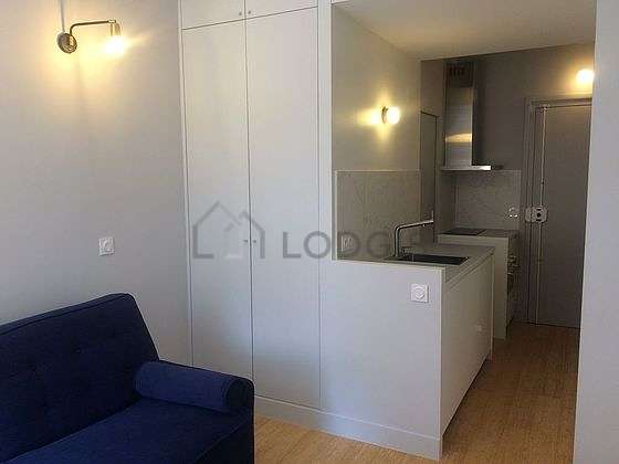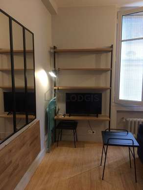 Living roomThis apartment consists of a wonderful living room with wooden floor and its double-glazed windows. This very quiet living room is furnished and equipped for a comfortable stay: tv, linen, quilt, sofa, dining table, desk, wardrobe, bookcase, shelves, closet, cupboard, 1 chair(s), stool, airer, mirror, bin1 sofabed(s) of 140cm.