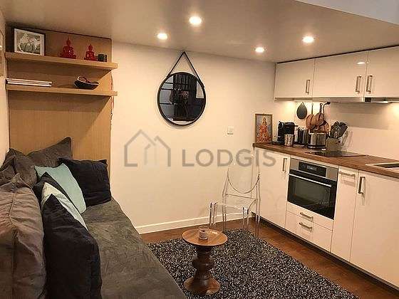 This apartment consists of a fabulous living room with wooden floor and its windows. This very quiet living room is furnished and equipped for a comfortable stay: sofa, coffee table, desk, 3 chair(s), chandelier, mirror, curtains, carpet.