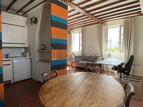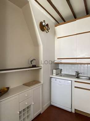 This duplex consists of kitchen with a floor tiles floor and all the essential equipment for your daily life: hob, refrigerator, freezer, oven, microwave oven, extractor hood, toaster, kettle, coffee-maker, dining table, shelves, cupboard, crockery, 4 chair(s).