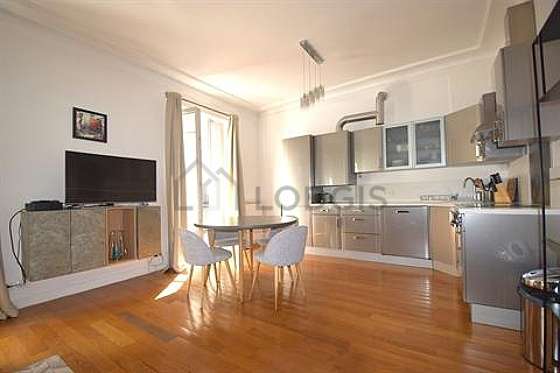 This apartment consists of a pleasant living room with wooden floor and its windows. This quiet living room is furnished and equipped for a comfortable stay: tv, linen, refrigerator, sofa, 1 armchair(s), dining table, wardrobe, shelves, storage space, crockery, mirror, bin, vase.