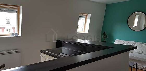 Living roomThis apartment consists of a charming living room with wooden floor and its windows. This quiet living room is furnished and equipped for a comfortable stay: tv, sofa, coffee table, shelves, cupboard, tv stand.