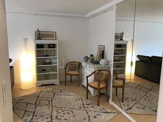 This apartment consists of a wonderful living room with wooden floor and its double-glazed windows with balcony. This very quiet living room is furnished and equipped for a comfortable stay: tv, sofa, 1 armchair(s), dining table, wardrobe, bookcase, shelves, storage space, cupboard, crockery, floor lamp, tv stand, mirror, painting, carpet, vase.