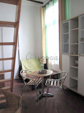 This apartment consists of a living room with a floor tiles floor and its windows and view on courtyard. This very quiet living room is furnished and equipped for a comfortable stay: tv, linen, quilt, 1 armchair(s), dining table, wardrobe, shelves, cupboard, 2 chair(s)1 futon(s) of 90cm, 1 loft bed(s) of 140cm.