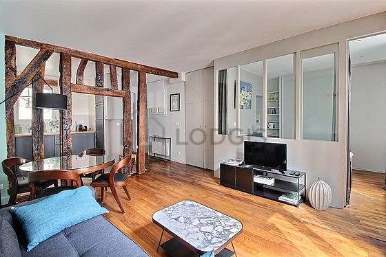 Living roomThis apartment consists of a fabulous living room with wooden floor and its windows. This very quiet living room is furnished and equipped for a comfortable stay: tv, sofa, dining table, shelves, 1 chair(s).