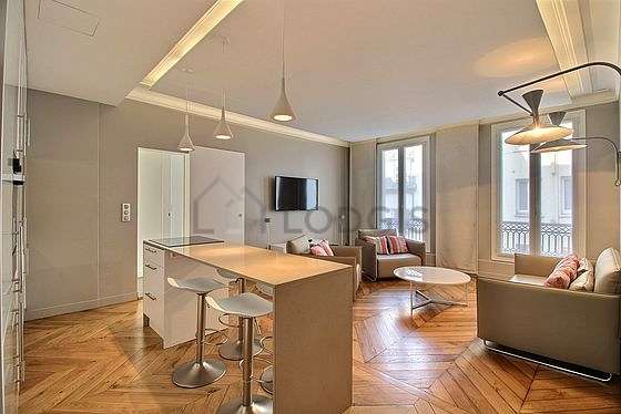 This apartment consists of a wonderful living room with wooden floor and its double-glazed windows. This very quiet living room is furnished and equipped for a comfortable stay: tv, sofa, 1 armchair(s), stool, bar, floor lamp, tv stand, coat stand, bin.