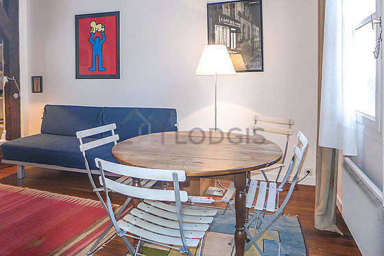 Living roomThis apartment consists of a pleasant living room with wooden floor and its windows. This quiet living room is furnished and equipped for a comfortable stay: tv, linen, quilt, sofa, dining table, wardrobe, wooden beams, 1 chair(s)1 sofabed(s) of 130cm.
